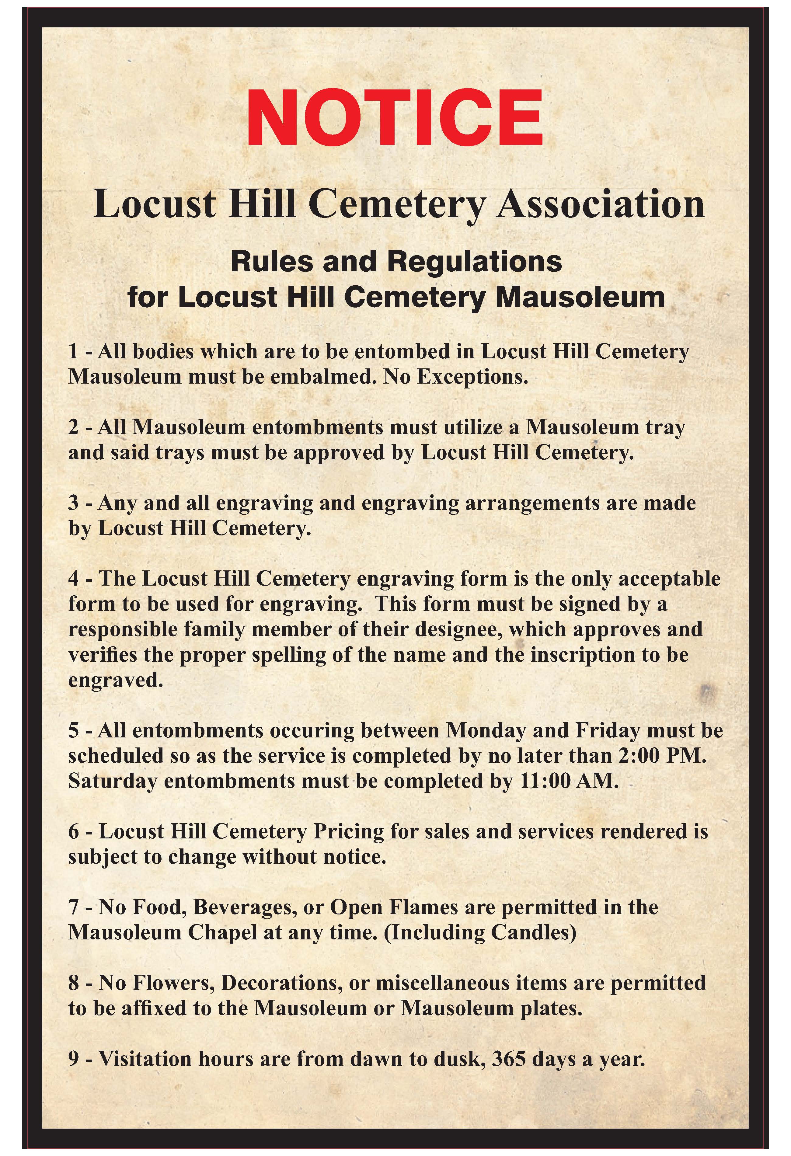 A cemetery is the place where the dead are buried or interred — a "final resting place" for the deceased. Locust Hill Cemetery offers various types of grave spaces for earth burial and mausoleum crypts for entombment. Similar options are available for burial or entombment of cremated remains.